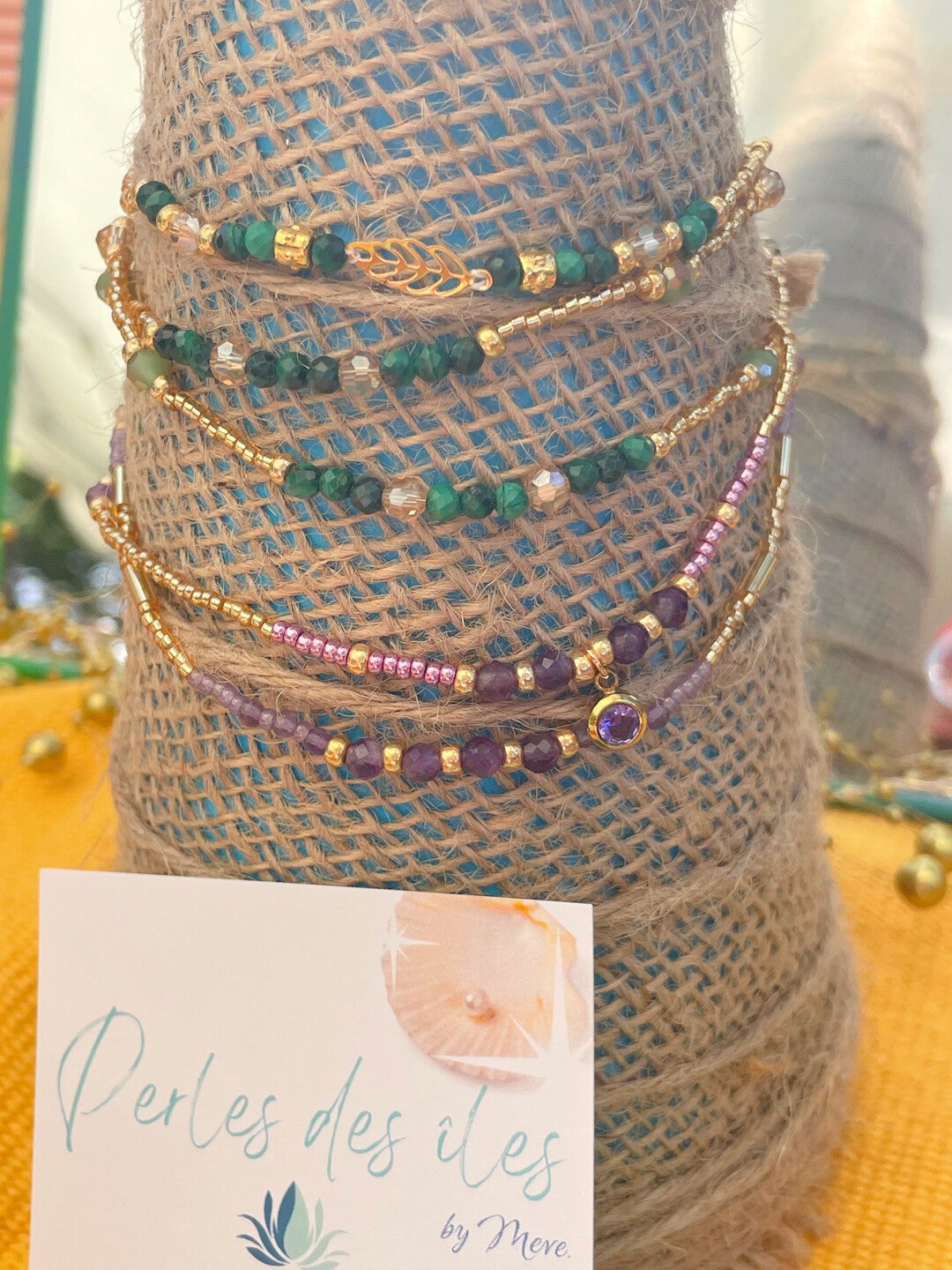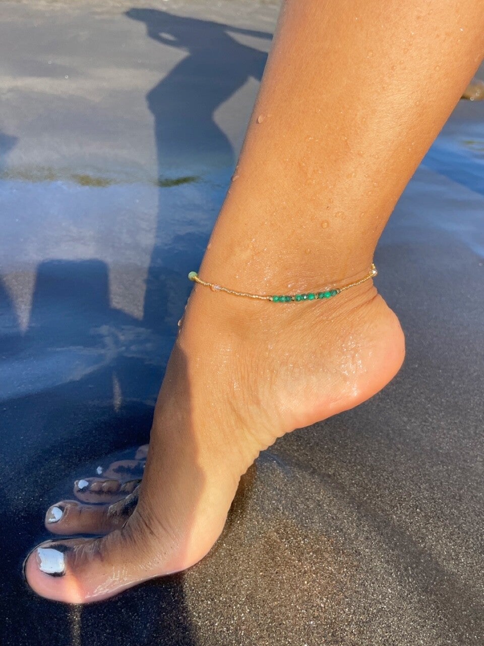 Bijoux de cheville raffiné tout en perles de verres dorées, vertes et perles facettées de Malachite.